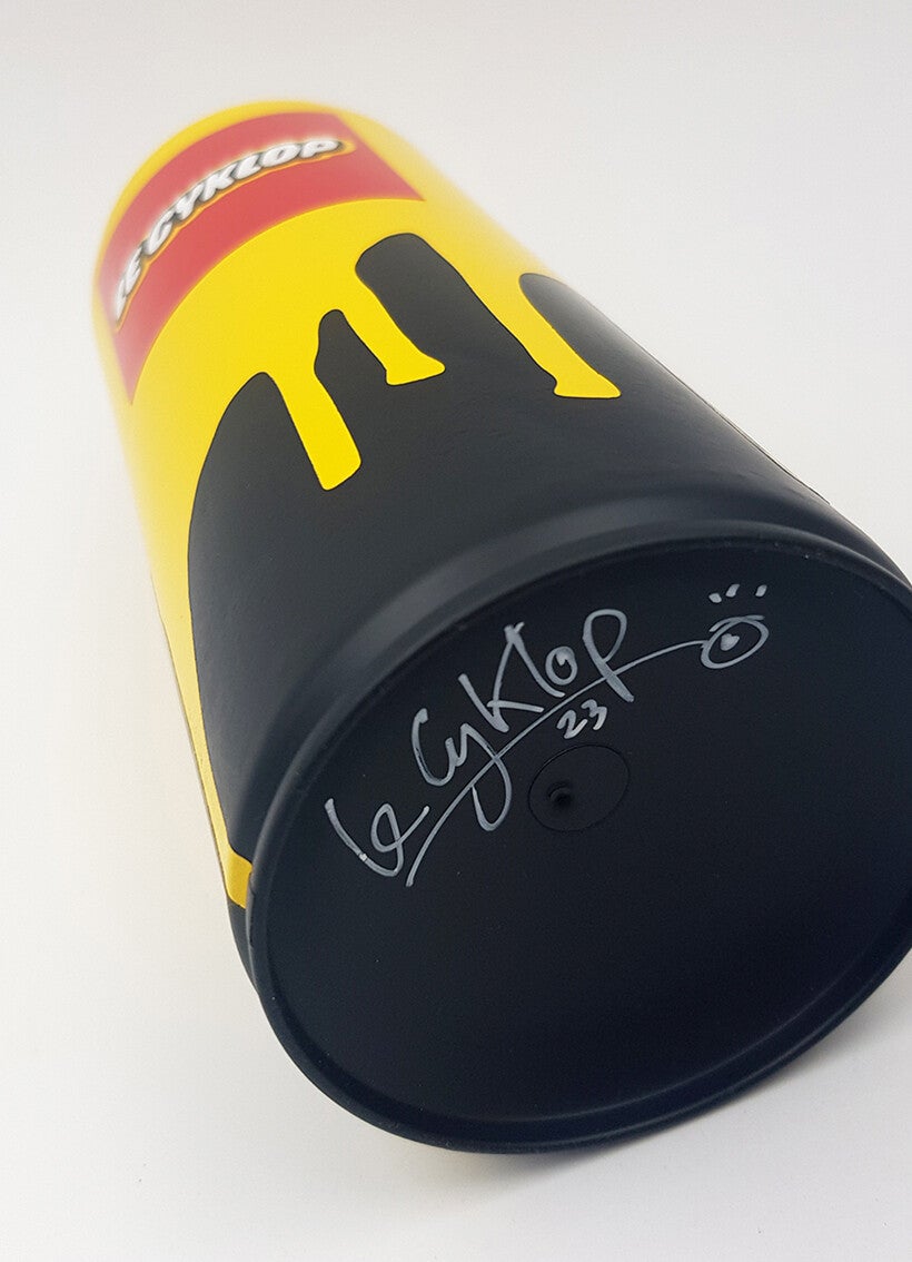 Peinture et stickers vinyls sur bombe aérosol vide.Hauteur : 11 cm - Diam. : 4,5 cmSigné au cul : Le CyKlop 2023
