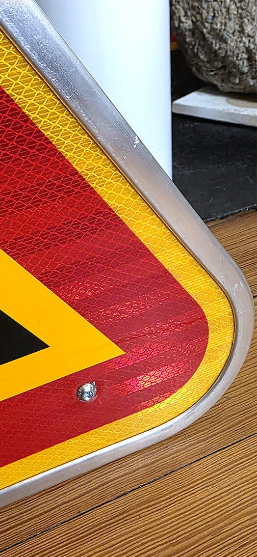 Matériaux : panneau de signalisation (état neuf) en aluminium, film rétroréfléchissant, stickers vinyles