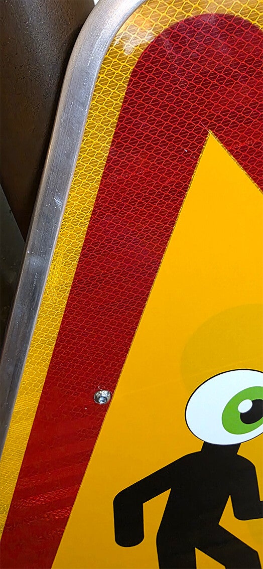 Autoportrait sculptural réalisé à partir d’un panneau de signalisation monobloc en aluminium. La surface est recouverte d’un film rétroréfléchissant et d’applications en stickers vinyles. Chaque pièce est créée et assemblée dans l’atelier du CyKlop.