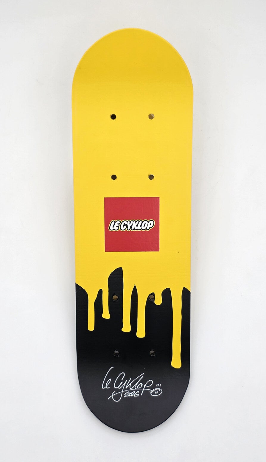 Mini skate L'Égo CyKlop - Peinture acrylique, bombe aérosol et pochoir sur planche de skate en bois.