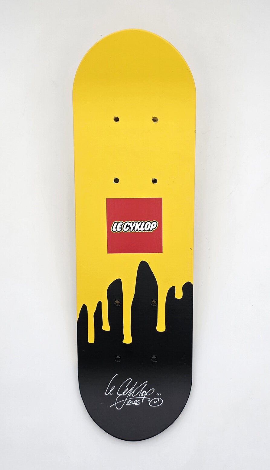 Mini skate L'Égo CyKlop - Peinture acrylique, bombe aérosol et pochoir sur planche de skate en bois. Dimension : Hauteur : 43 cm - Largeur : 12 cm