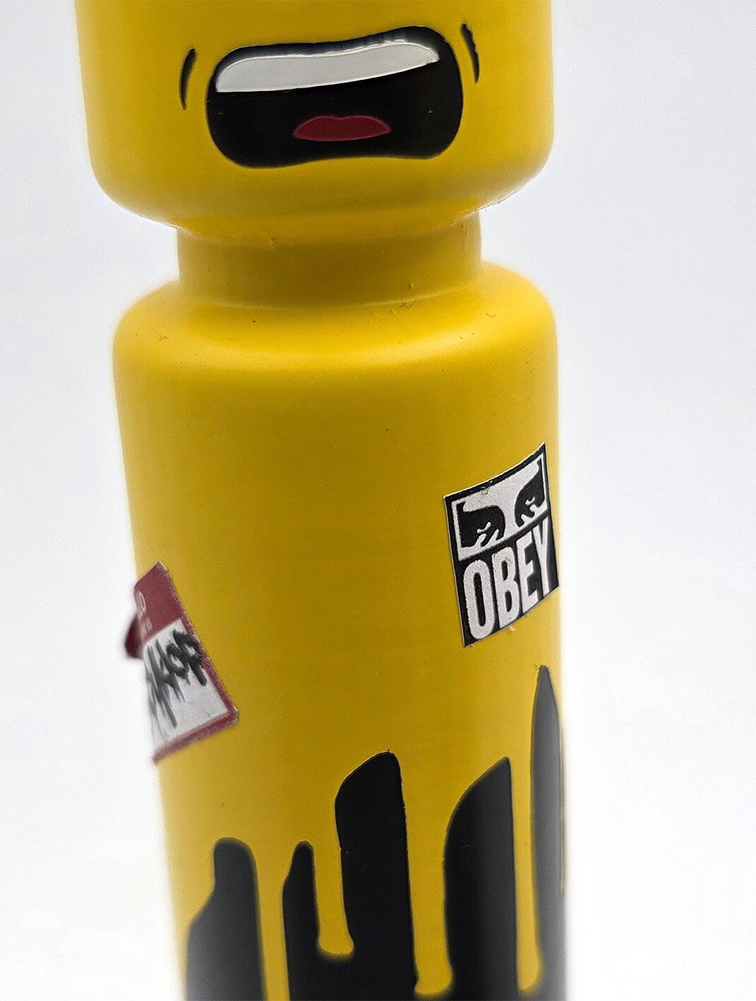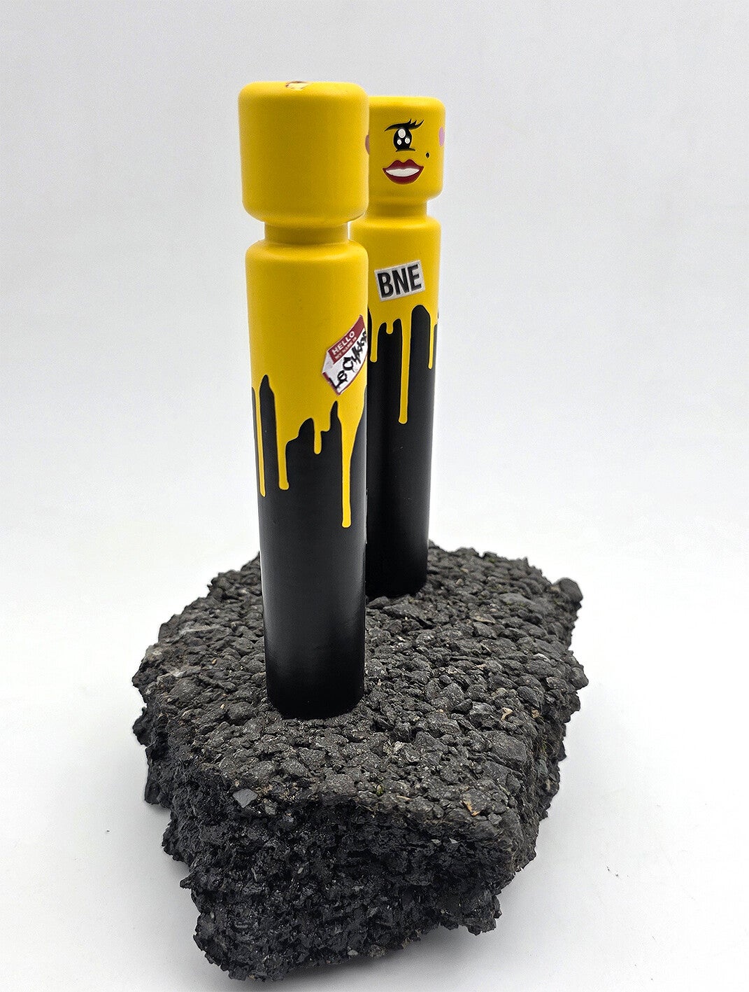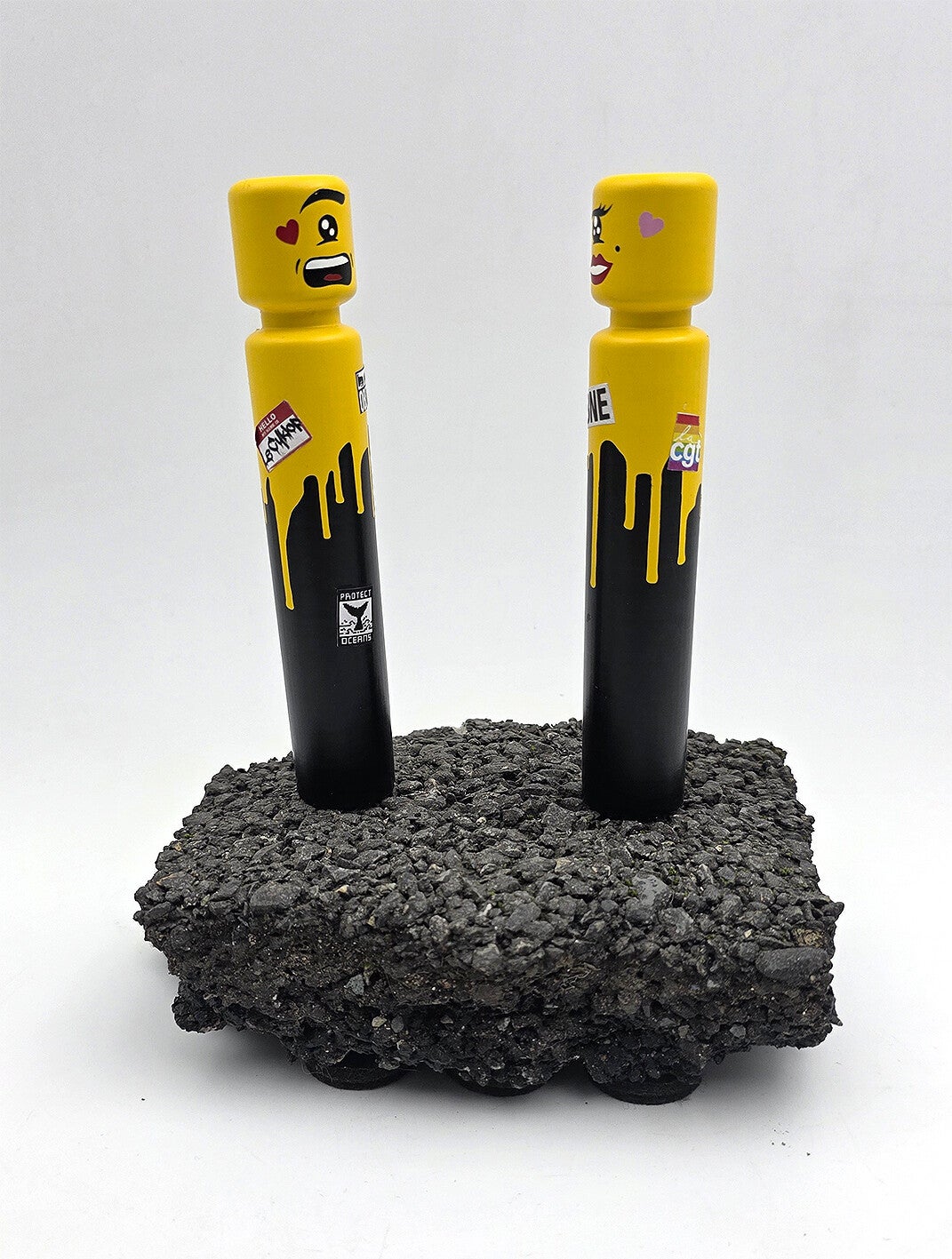 L'Égo CyKlop miniature, deux figurines fixées sur un morceau de macadam. Pièce unique.Signature sur un morceau d'ardoise récupéré dans la rue après la tempête.