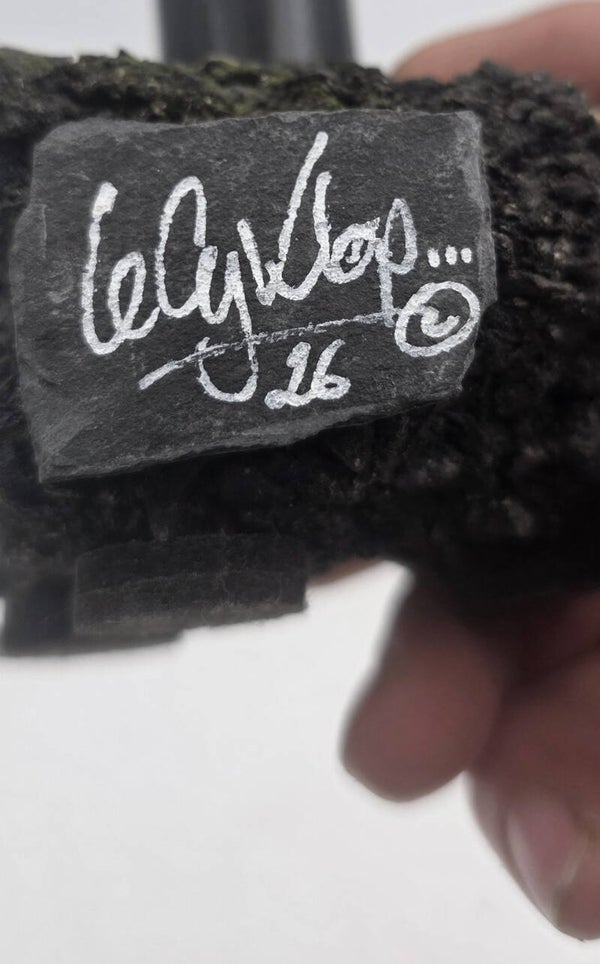 CyKlop parisien miniature, figurine fixée sur un morceau de macadam. Pièce unique.Signature sur un morceau d'ardoise récupéré dans la rue après la tempête.