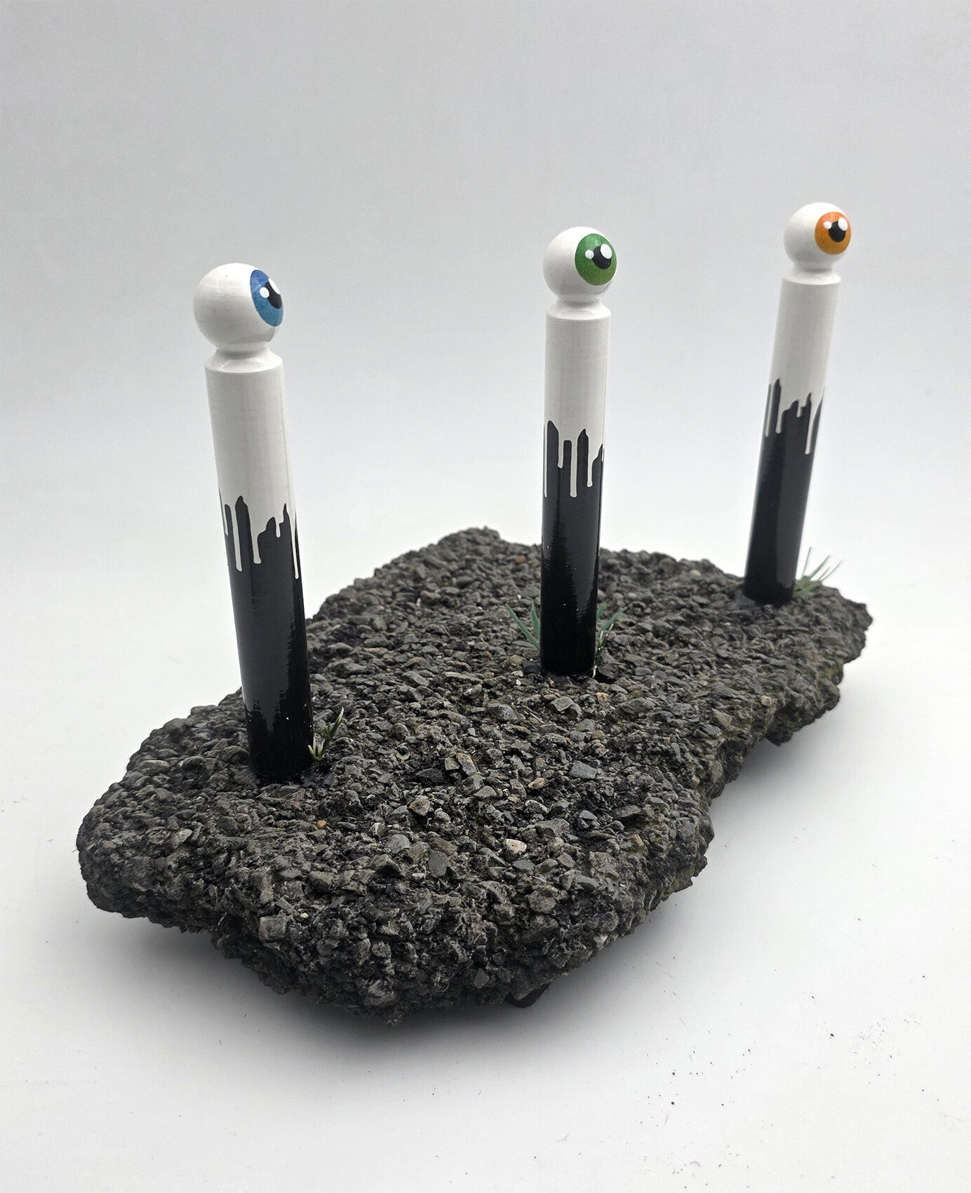 CyKlop parisien miniature, trois figurines fixée sur un morceau de macadam. Pièce unique.Signature sur un morceau d'ardoise récupéré dans la rue après la tempête.