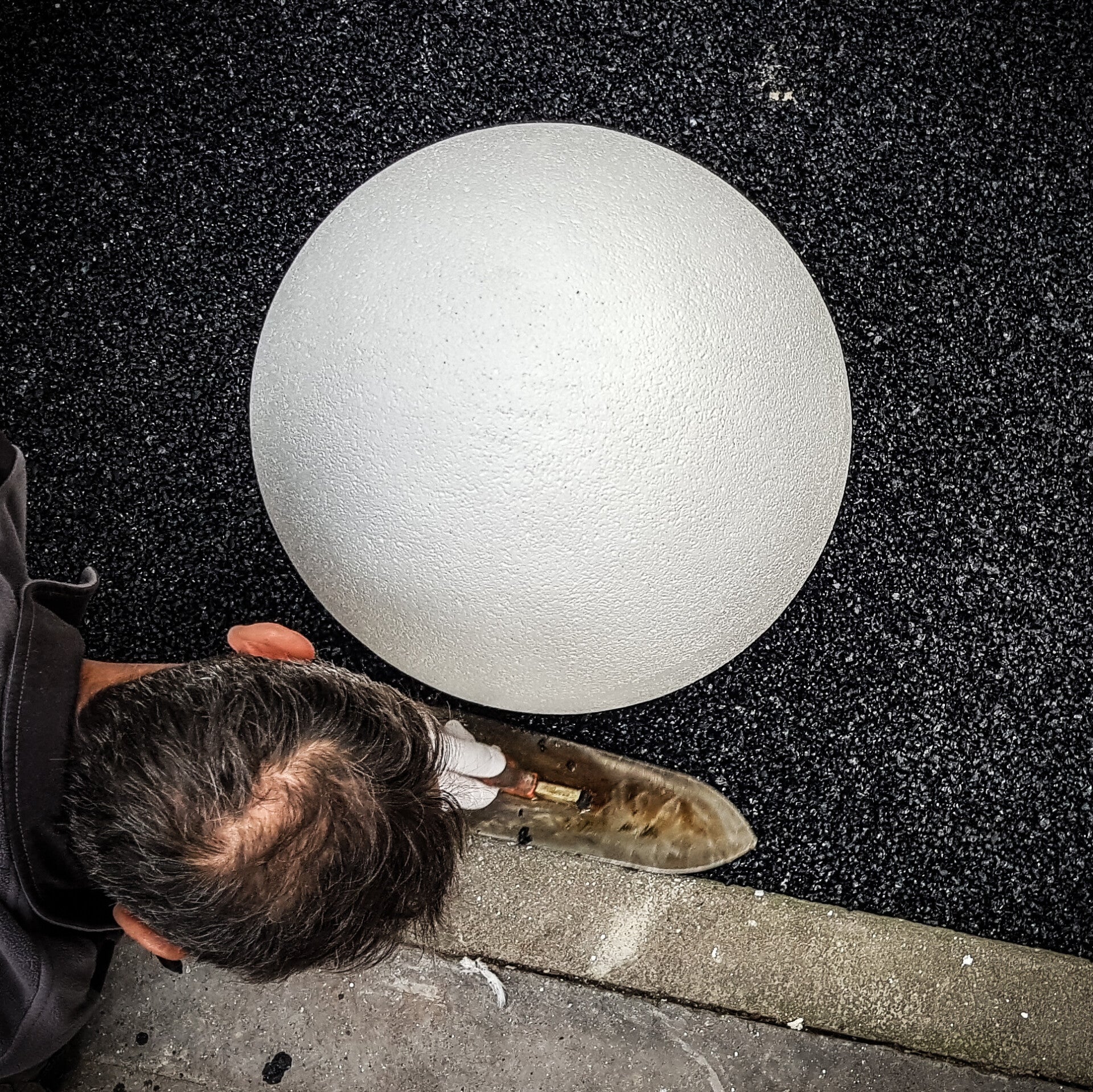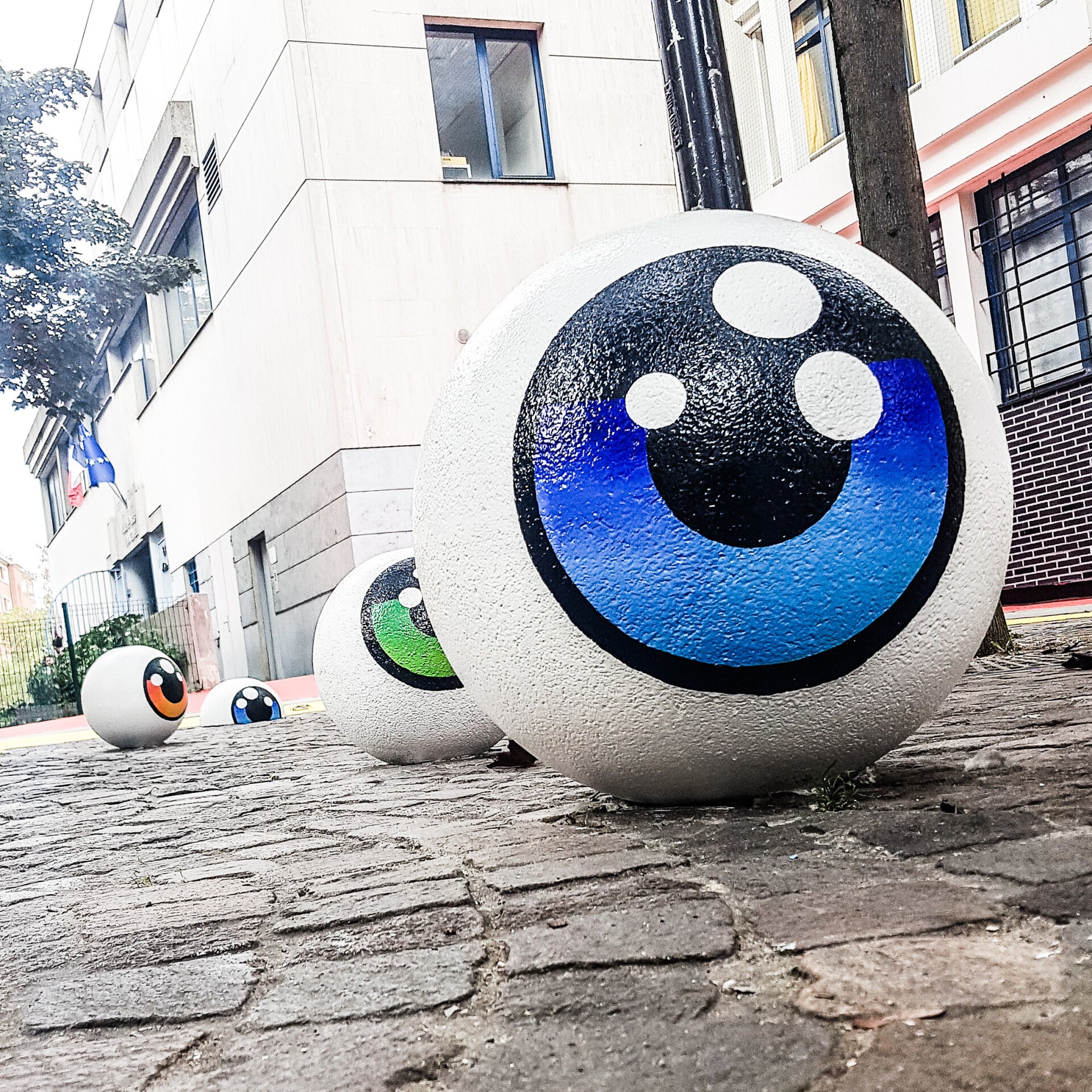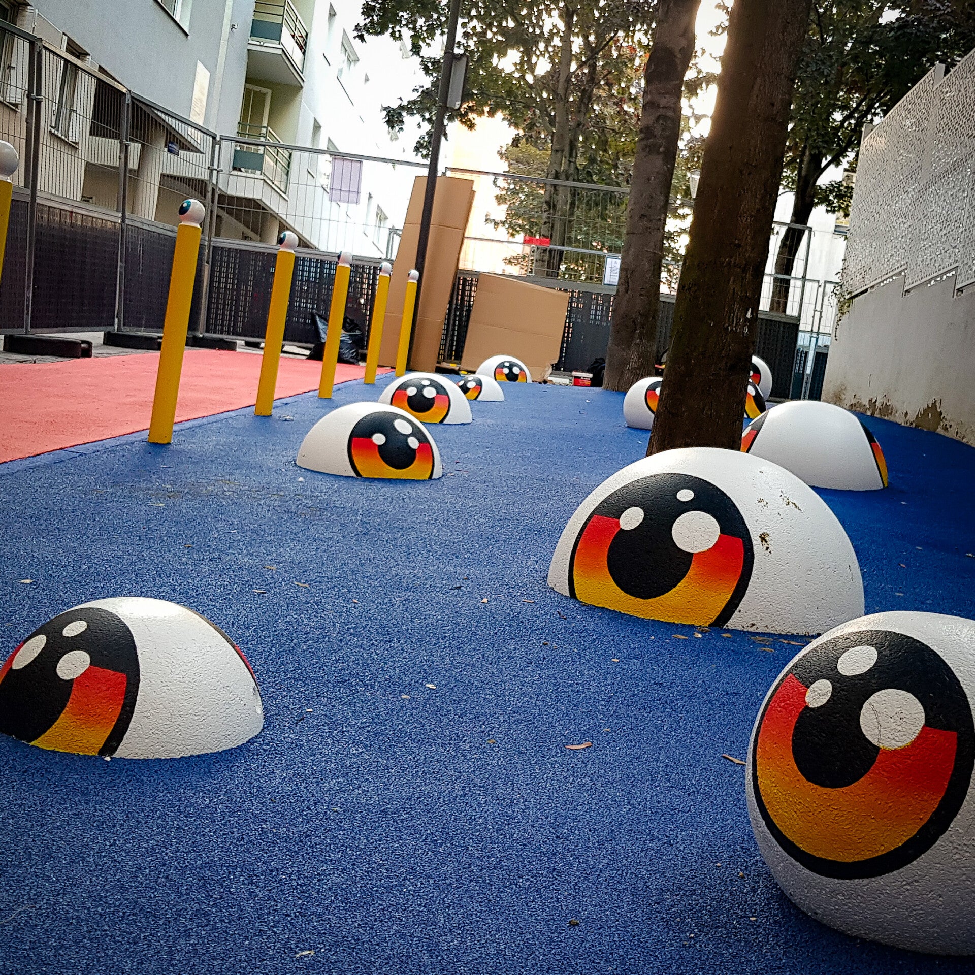 © ADAGP Le CyKlop 2021 - Boules peintes et sol souple en granulat de caoutchouc recyclé. Mobilier urbain et trottoirs peints. Avec le soutien de la société ProUrba.